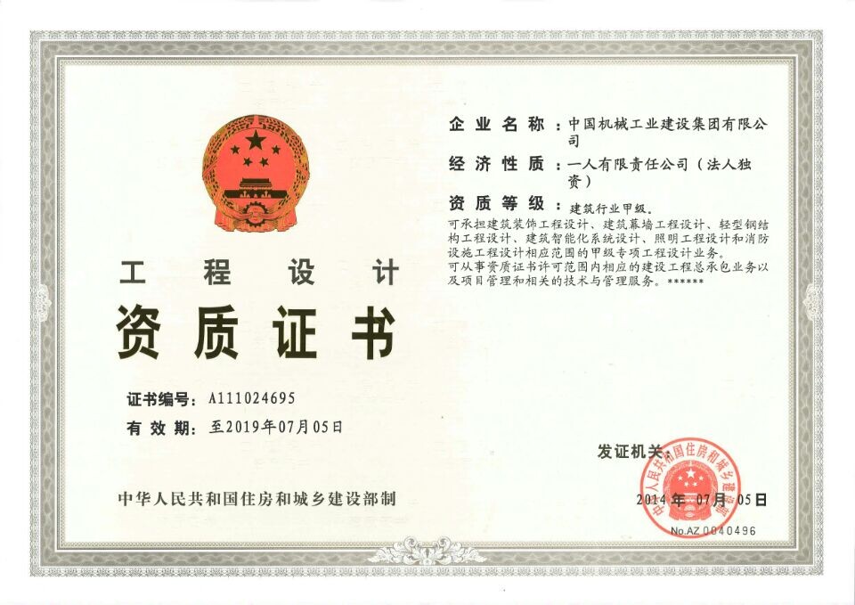 中國(guó)建設(shè)工程設(shè)計(jì)資質(zhì)甲級(jí)證書