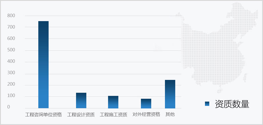 集團(tuán)及所屬企業(yè)目前具備由國(guó)家住建部、發(fā)改委、商務(wù)部、質(zhì)檢總局、工信部等國(guó)家部委行政許可的各類企業(yè)資質(zhì)1000多項(xiàng),以及更多的地方政府、協(xié)會(huì)批復(fù)的資質(zhì)證書,每年經(jīng)集團(tuán)初審上報(bào)通過的各類企業(yè)資質(zhì)300多項(xiàng)。